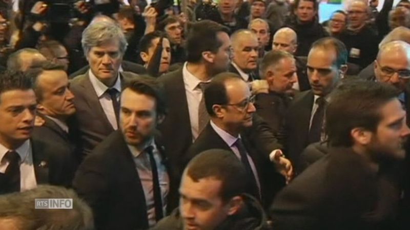 A peine une heure après son arrivée, François Hollande voit se dresser un premier obstacle. Une centaine d’éleveurs vêtus de tee-shirts noirs l’attendent, de chaque côté de l’allée où sont présentées les vaches laitières. « Le chef de l’État nous tourne le dos, alors qu’on est en train de mourir, lance Adrien, un éleveur venu de Rhône-Alpes. Alors on lui tourne le dos aussi, pour lui montrer notre mépris. »Soudain, sifflets et insultes fusent. « Hollande, démission ! », lancent les manifestants, montés sur les portants des stands de la race Prim’Holstein. Et les mots ne sont pas les seuls à voler : de la bouse est lancée en direction du président de la République, sans le toucher. « François Hollande et Stéphane Le Foll se moquent de nous, ils ne font rien pour les agriculteurs », assène Adrien, alors que le chef de l’Etatest évacué par son service d’ordre.