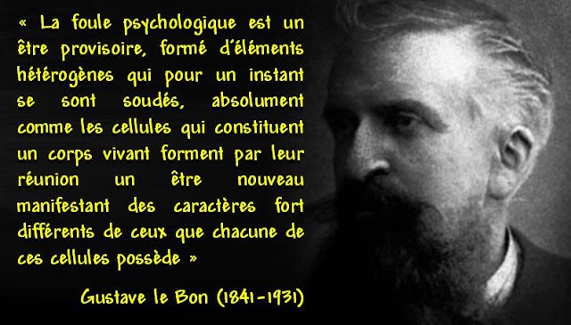 Gustave le Bon, dont les travaux font toujours référence, avait démontré à travers les caractéristiques de cet “être éphémère” les possibilités offertes à des meneurs, qu’ils soient révolutionnaires ou légalistes de transformer une masse d’individus, dont les sens critiques individuels sont annihilés par une passion collective incontrôlée, en arme redoutable.