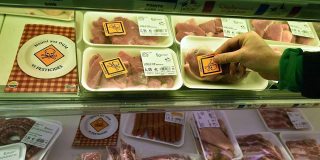 Les animaux nourris aux OGM sont ensuite consommés par les humains, une situation que dénoncent régulièrement les associations environnementales, comme ici en mai dernier.