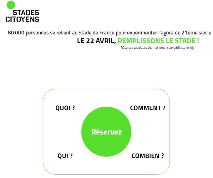 Stades citoyensIl s’agit d’un événement ne s’appuyant que sur la volonté des citoyens et le financement par les citoyens, avec pour ambition de rendre visible les solutions citoyennes facilement appropriables, ainsi que d’expérimenter les outils de l’intelligence collective, les innovations démocratiques. Créer du lien ! Relier les collectifs et les citoyens !