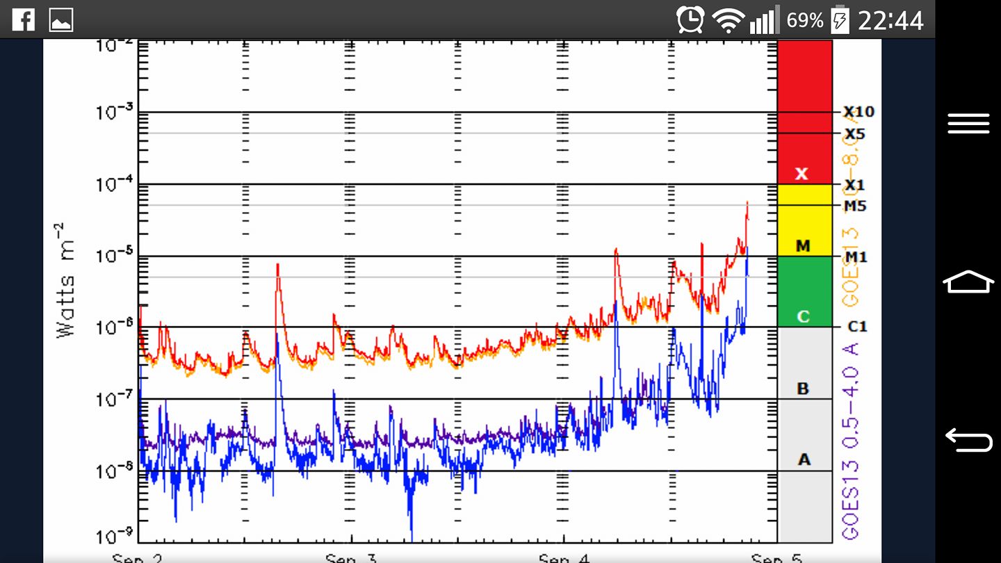 Dimanche, le soleil a connu un pic d’activité énorme, proche du X (voir diagramme ci-dessous).