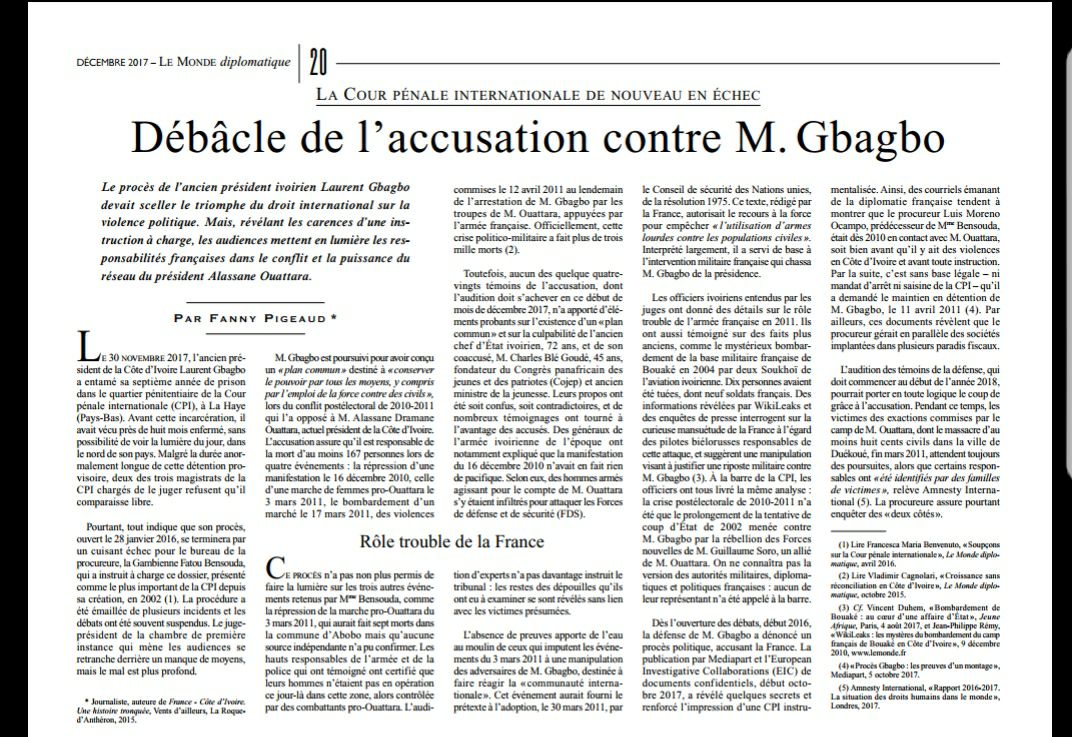 Dès l’ouverture des débats, début 2016, la défense de M. Gbagbo a dénoncé un procès politique, accusant la France. La publication par Mediapart et l’European Investigative Collaborations (EIC) de documents confidentiels, début octobre 2017, a révélé quelques secrets et renforcé l’impression d’une CPI instrumentalisée. Ainsi, des courriels émanant de la diplomatie française tendent à montrer que le procureur Luis Moreno Ocampo, prédécesseur de Mme Bensouda, était dès 2010 en contact avec M. Ouattara, soit bien avant qu’il y ait des violences en Côte d’Ivoire et avant toute instruction.