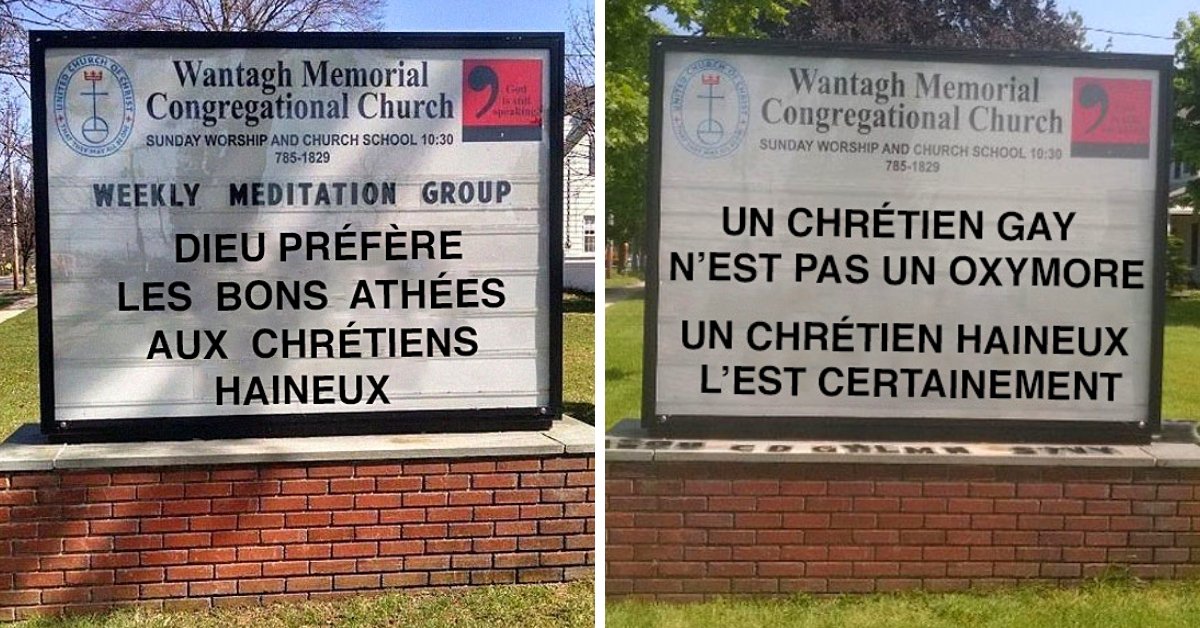 Comme beaucoup d’églises aux États-Unis, la Wantagh Memorial Congregational Church de New York dispose d’un panneau lui servant à diffuser des messages. Ron Garner en profite donc pour exprimer le fond de sa pensée au plus grand nombre, croyants comme non-croyants.