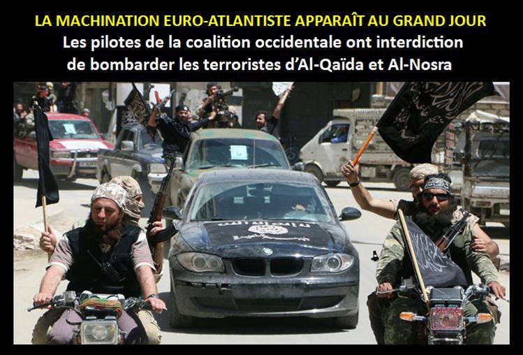 L’hebdomadaire français “Le Canard Enchaîné” du 6 octobre 2015, repris par l’Agence russe Sputnik le 8 octobre, révèle que « Les pilotes américains et alliés de la coalition opérant en Syrie et en Irak ont reçu l’ordre de ne jamais frapper les terroristes du groupe Front al-Nosra, la filiale syrienne d’Al-Qaïda.»
