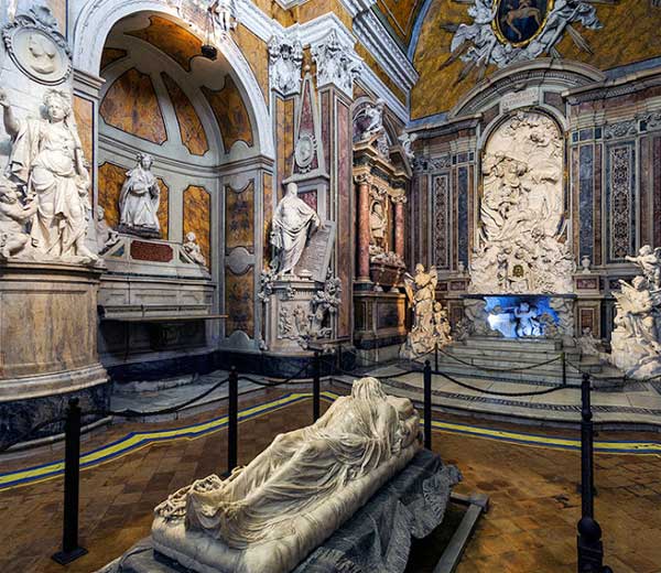L’exemple le plus convaincant en est le Christ Voilé. Placée au milieu de la chapelle, cette sculpture du Christ recouvert d’un fin voile est de nature à susciter le trouble : comment cette sculpture en marbre taillée dans un bloc à l’aide d’un ciseau a-t-elle été faite ? Le voile est trop… réaliste.