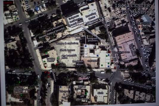Photo satellite légendé, transmise par des opposants syriens, en 2013 ou 2014, aux services secrets américains. Il s’agit du complexe servant de quartier général à l’organisation Etat islamique à Manbij, une ville du nord de la Syrie. Elle fait apparaître le centre d’entraînement des djihadistes, l’hôtel hébergeant les recrues étrangères, la prison, la clinique, ainsi que l’emplacement de mines, de snipers et de gardes. Laurence Geai/Sipa Pour Le Monde
